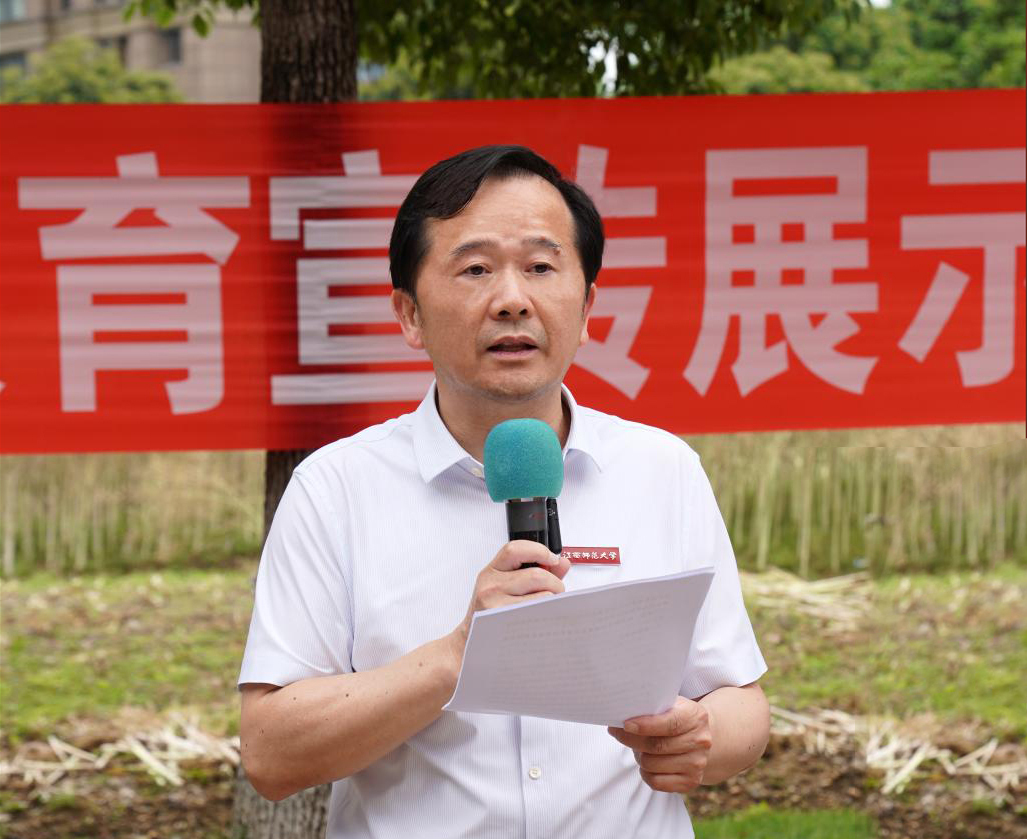 油籽翻金浪,书香满校园。5月6日下午,学校劳动教育宣传展示月活动启动仪式在瑶湖校区弘德园举行。校党委书记朱小理出席。学校劳动教育工作领导小组成员单位负责人,马克思主义学院、物理与通信电子学院、化学与材料学院、生命科学学院、体育学院、地理与环境学院、新闻与传播学院、国际教育学院等学院负责人和百余名师生代表参加。校党委常委、副校长钟业喜主持启动仪式。