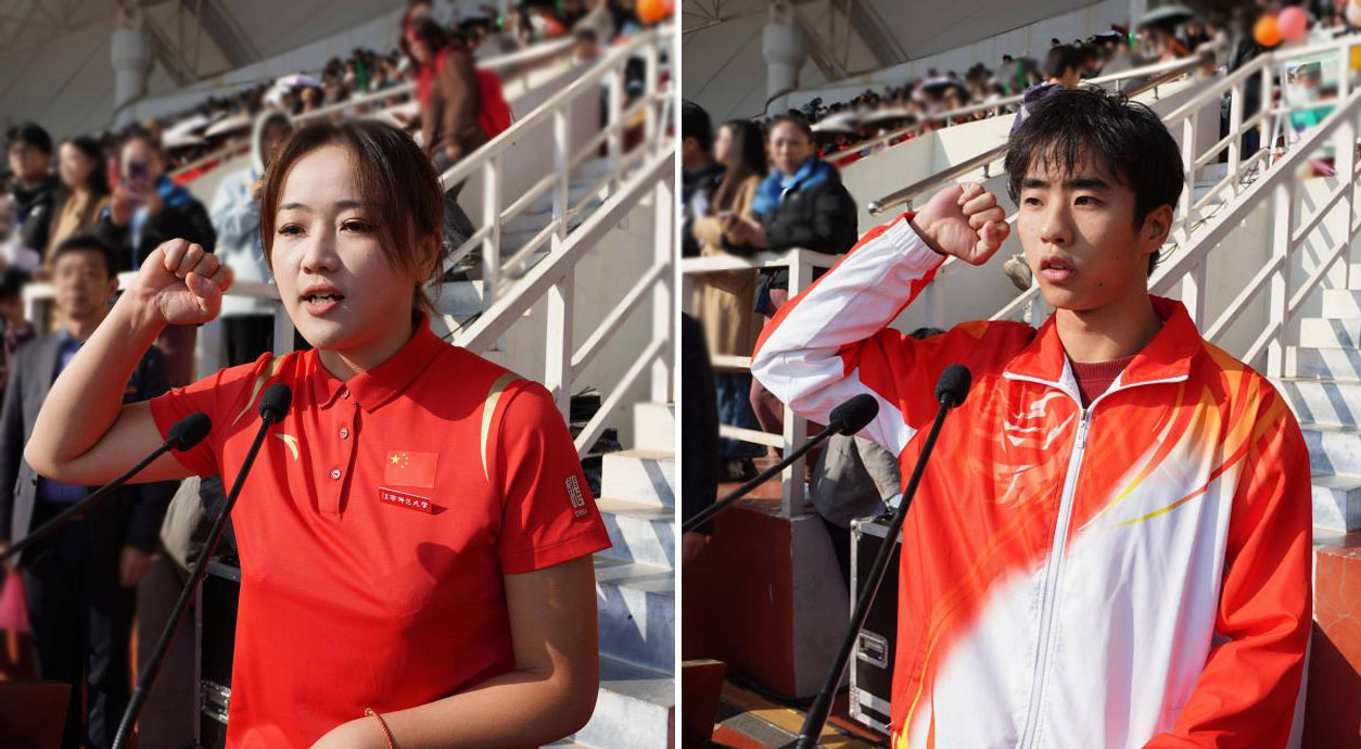 体育学院涂雨思老师、2023级体育教育2班袁彬人同学分别代表裁判员、运动员宣誓。
