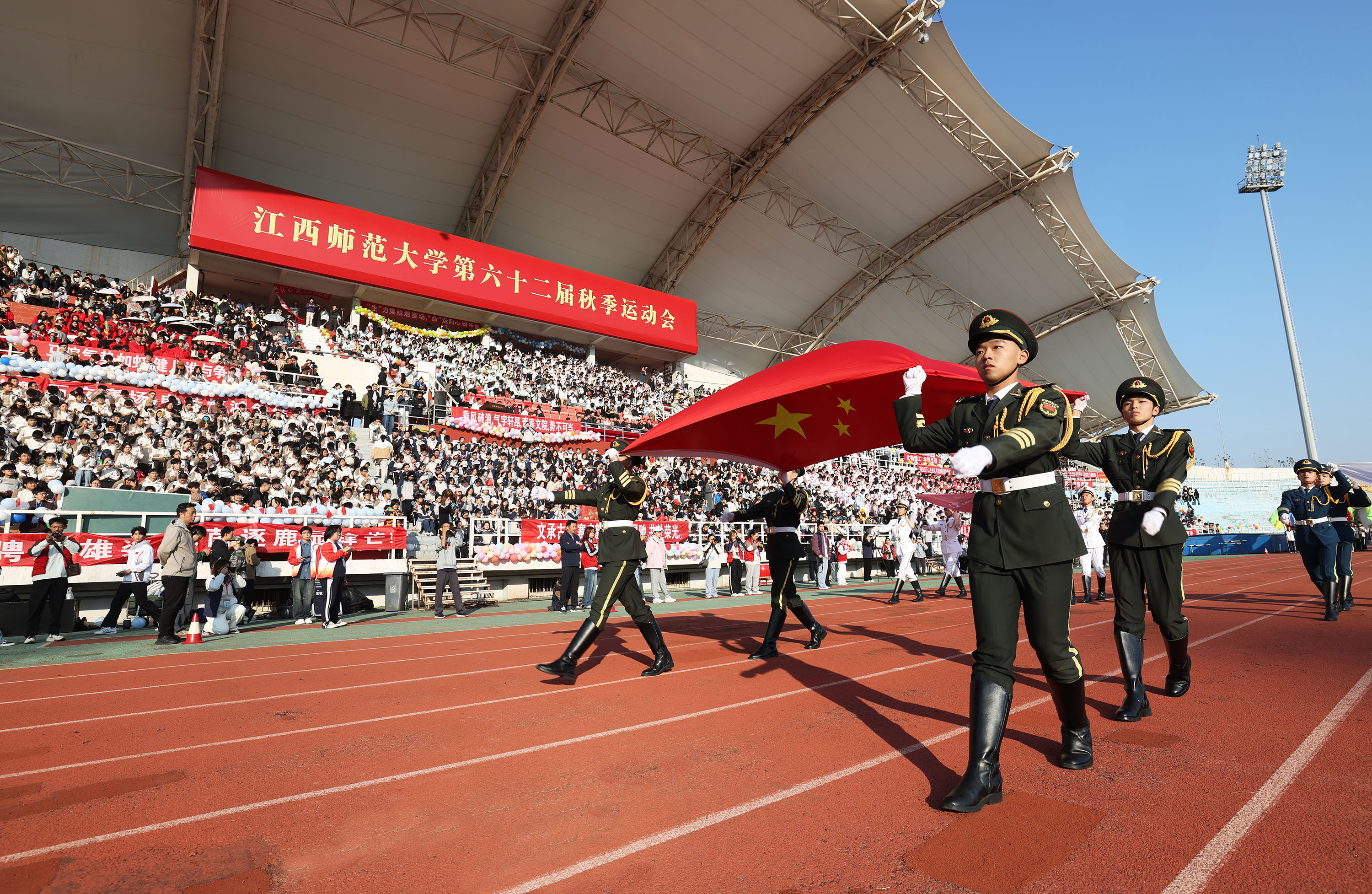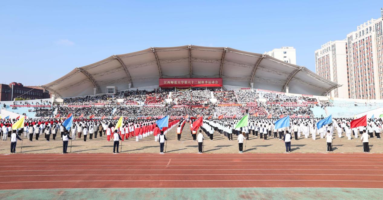 10月23日上午,学校第六十二届秋季运动会在瑶湖体育场开幕。在校学校领导朱小理、舒平贵、钟业喜,校党委常委郭亮亮、王一喜出席。学校各职能部门负责人、校体育工作委员会全体委员、全体运动员,以及学生代表1万余人参加。开幕式由校党委常委、副校长董圣鸿主持。