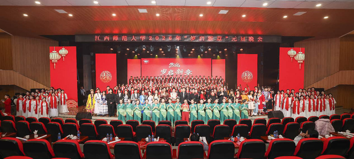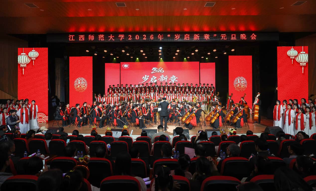 晚会在音乐学院青蓝交响乐团带来的《星辰大海》和《红色娘子军》气势磅礴的乐声中拉开帷幕,激昂的旋律瞬间点燃全场。整场演出节目丰富、形式多样。女声独唱《越来越好》婉转动听,唱出了对新年的美好愿景;《节日欢歌》舞姿优美,将传统舞蹈的喜庆韵律与新年的热闹氛围完美交融;朗诵《闪耀吧 青春》用铿锵有力的话语展现了青春的模样,传达了师大学子的热血与担当;《我的入党志愿书》让观众在歌声中重温那份跨越时空的庄严承诺。留学生们带来曲艺快板《唱南昌》,快板声声节奏明快,尽展地方民俗特色;在《同心石榴籽·筑梦中华情》中,各民族学子身着民族特色服饰,诠释民族一家亲;交响合唱《在灿烂阳光下》,奏响了对未来的美好期盼。全场齐声合唱《歌唱祖国》,激昂旋律响彻会场,在热烈的掌声中,晚会正式落下帷幕。
