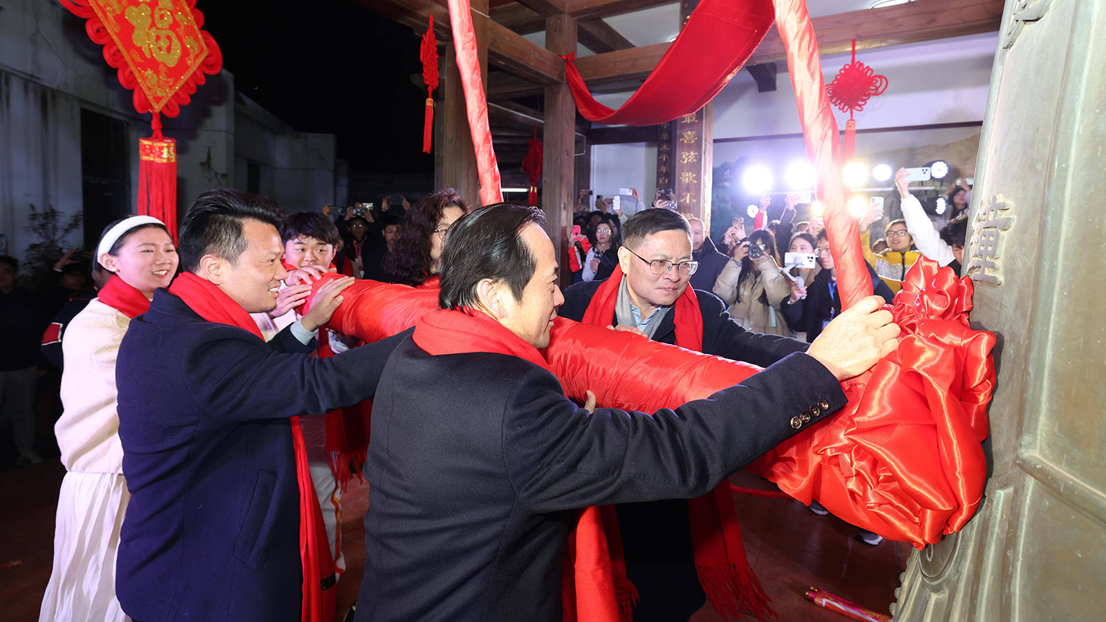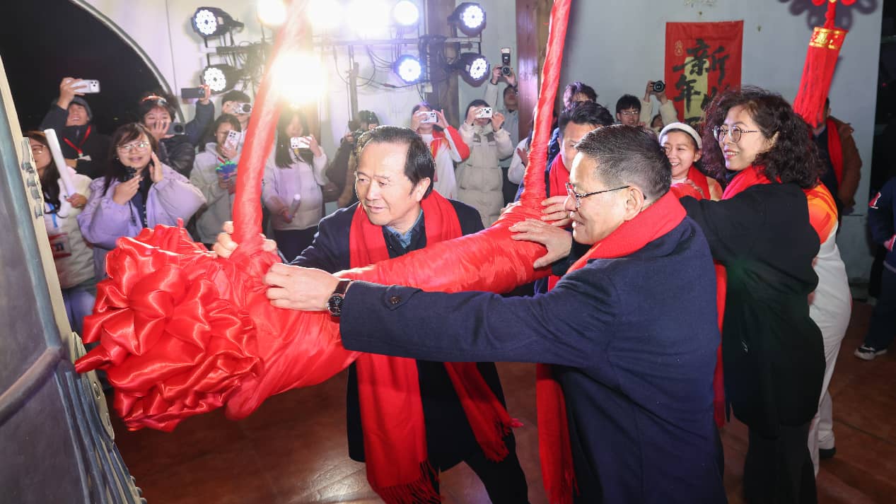 2026年1月1日零点,校党委书记朱小理,校长陈芬儿院士与校友代表2010级美术学院硕士毕业生、南昌水木源文化艺术有限公司董事长、赣州天行阳明高级中学校长丁小龙,新闻与传播学院研究生导师、副教授李海丽,体育学院2023级运动训练本科生、江西好人荣誉获得者李丰旭同学,化学工程学院2023级材料与化工专业硕士研究生王约英同学等一同登上图文信息中心钟楼,共同敲响新年的钟声。