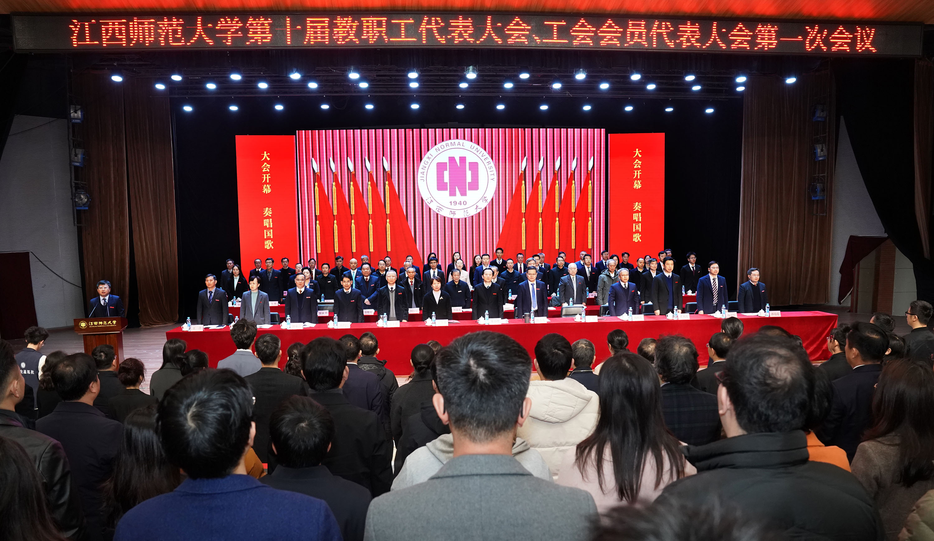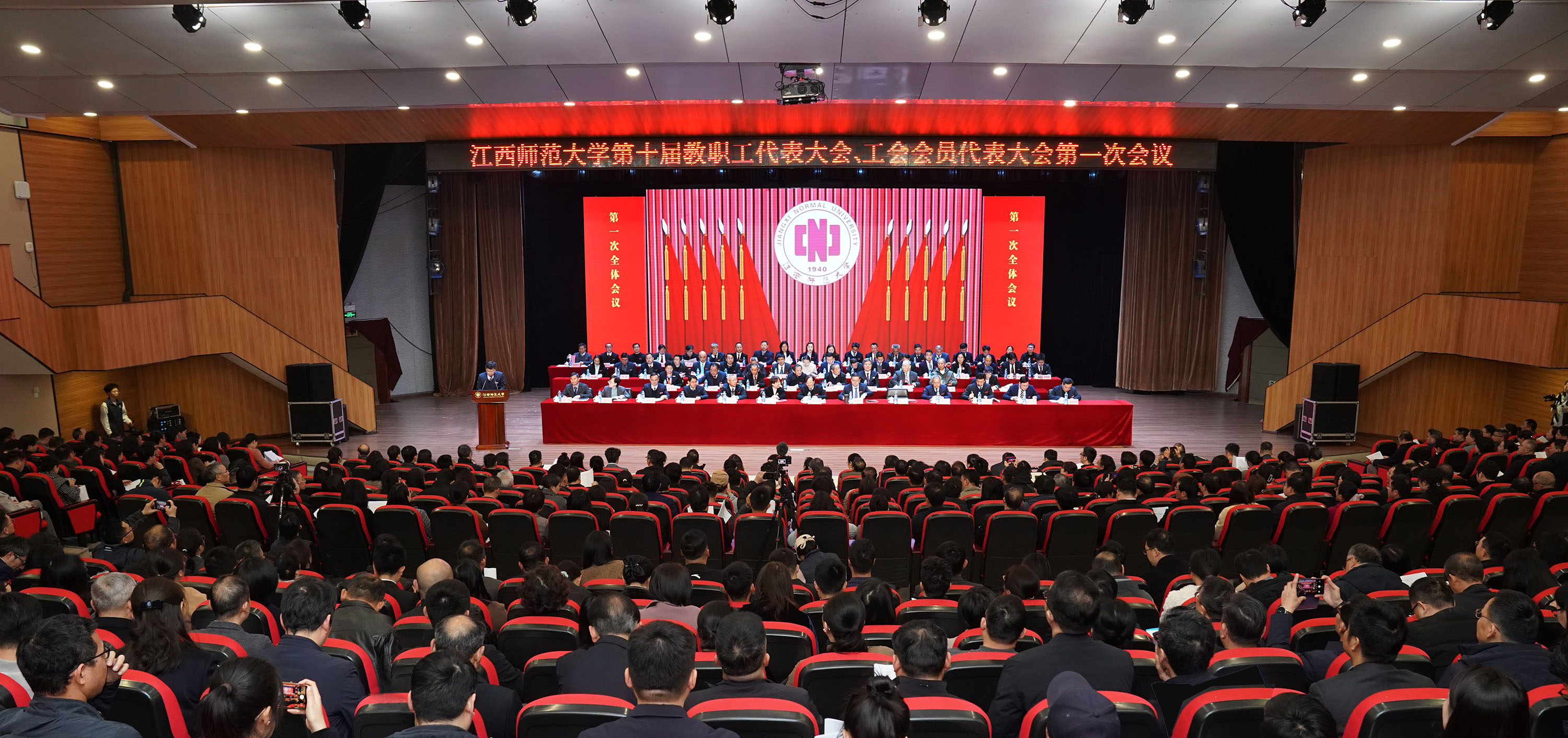 春潮涌动千帆竞,砥砺前行正当时。3月21日上午,我校第十届教职工代表大会、工会会员代表大会第一次全体会议在瑶湖校区实验剧场召开。校党政班子成员朱小理、陈芬儿、舒平贵、周利生、刘利民、董圣鸿、钟业喜、杨卫军、葛咏、郭亮亮、王一喜,历任校领导熊大成、黄恩华、邹道文、曹达忠、何小平、聂剑、徐耀耀、赵明,全国两会代表邬成香出席大会。江西省教育工会主席宋懿非到会指导。来自全校教学、科研、管理和服务等岗位的正式代表、特邀代表、非代表的副处级以上干部、附属学校主要负责人、部分学生代表共400余人参加会议。开幕式由校党委副书记汪洋主持。